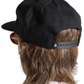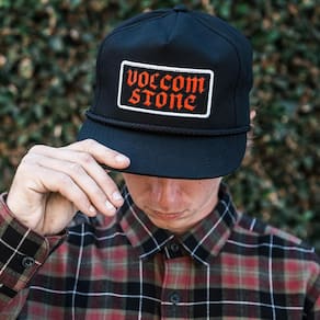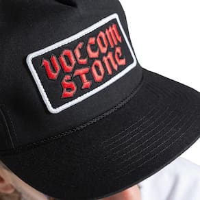 Boné Volcom de 5-panel, aba reta, patch frontal, corda trançada na aba e fechamento snapback.
