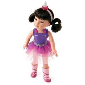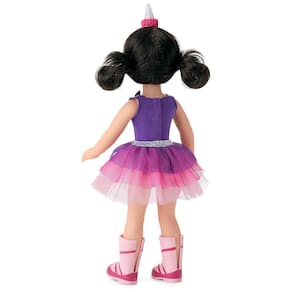 Uma boneca Emerson de com o tamanho certo para meninas mais novas. Ela tem olhos castanhos escuros e cabelos pretos em tranças encaracoladas. Um lindo collant roxo com um rosto de unicórnio prateado e orelhas de tecido. Uma saia de malha removível em camadas rosa e roxa com um cós elástico brilhante e um par de cuecas rosa claro. Uma tiara com um chifre de unicórnio prateado. Um par de botas galochas rosa que parecem sapatilhas de balé Marca: Não Informado