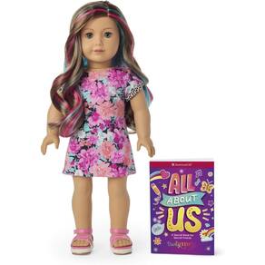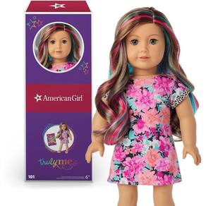 American Girl Boneca Truly Me #101 de 45,7 cm com olhos grisalhos, cabelo caramelo com destaques, pele macia a média, vestido, para maiores de 6 anos - A boneca Truly Me de 45,7 cm tem olhos realistas que abrem e fecham suavemente; cabelo realista que pode ser modelado; um corpo de algodão macio; e uma cabeça e membros móveis feitos de vinil suave - Mostre sua doce roupa lateral: um vestido de camiseta com estampa floral com punhos com estampa de leopardo; um par de roupas íntimas; e um par de alpargatas rosa cruzadas - The All About Us Journal