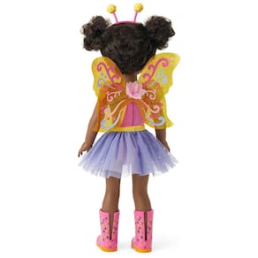 Uma boneca Kendall de com o tamanho certo para meninas mais novas. Ela tem olhos castanhos profundos e cabelo preto encaracolado em tranças. Um collant elástico rosa brilhante que brilha ao sol. Uma saia de malha pervinca brilhante com um cós amarelo e um par de cuecas rosa claro. Uma tiara com antenas de borboleta e um par de asas brilhantes amarelas amanteigadas com tiras elásticas. Um par de botas galochas florais rosa brilhante Marca: Não Informado