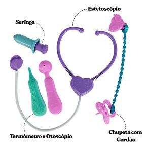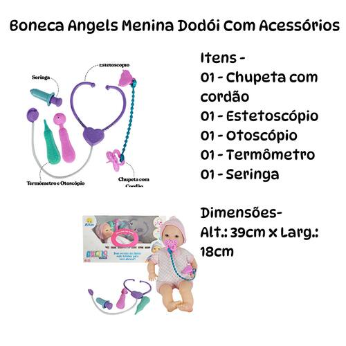 ESPECIFICAÇÕES: Material: Polietileno, Vinil e Roupa em Tecido Dimensões: Alt.: 39cm x Larg.: 18cm Peso: Aprox. 379g A boneca conta com: 01 - Chupeta com cordão 01 - Estetoscópio 01 - Otoscópio 01 - Termômetro 01 - Seringa Registro Inmetro: CE-BRI/IQB 4115 NM 300/2002 Contém: Boneca Angels Collection Fofinha Menina Dodói