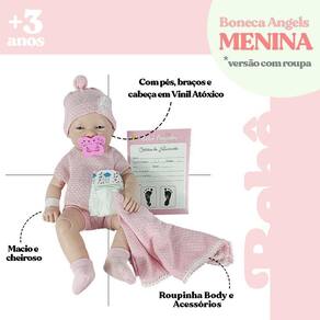 Boneca Anjo Cheirinho de Bebê Tamanho Real com Acessórios Boneca Anjo Com Roupinhas Fralda Chupeta Certidão Pulseira ============================================================ Contém: 01 Boneca 01 Chupeta 01 Manta 01 Touca 01 Par de Meia 01 Fralda 01 Certidão de Nascimento 01 Pulseira de Maternidade
