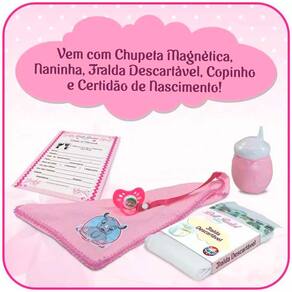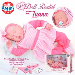 Boneca Articulada - 47 Cm - Doll Realist - Luana - Sid-Nyl: as crianças vão se divertir muito brincando com a boneca da coleção Doll Realist Sid-Nyl. Articulada e pesada como um bebê de verdade, a Boneca Luana Doll Realist precisa de todo o cuidado e amor do mundo. A Boneca Luana tem cabeça, braços e pernas em vinil siliconado, corpinho macio produzido tecido e pelúcia. Para deixar a brincadeira mais divertida, a boneca vem acompanhada de acessórios: copinho, brinco e chupeta magnética, naninha, fralda descartável e certidão de nascimento. Com imã interno na boca e na chupeta. Ao colocar a chupeta na boca da boneca, ela fica grudada como se a boneca estivesse chupando a chupeta. Com 47 cm de altura, a Doll Realist Luana também tem movimentos articulados para fazer poses divertidas durante a brincadeira. Encaixe em seu nenezinho sua naninha personalizada para um sono confortável, dê leitinho com seu copinho quando ela sentir fome, use a chupeta caso ela começa a chorar e não se esqueça de trocar as fraldinhas! Preencha sua certidão de nascimento para individualizar sua bonequinha. Cuide, eduque e aprenda muito com sua nova bebe reborn! • Detalhes: - Pintada a mão - Inúmeros acessórios - Incríveis detalhes realísticos - Brincos fofinhos carismáticos - Mais de 4 pontos de articulação - Inspirada em um bebezinho de verdade - Chupetinha magnética para maior estabilidade - Certidão de Nascimento para individualizar sua bebezinha - As crianças podem levar a boneca Luana para onde quiserem INFORMAÇÕES: • Produto: Boneca Doll Realist Luana • Marca: Sid-Nyl Brinquedos • Coleção: Doll Realist • Tipo: Boneca realista articulada • Categoria: Bonecas e Cia • Tamanho (C x A x L): 26 x 47 x 13.5 cm • Volume (Peso): 1.580 kg • Conteúdo: 1 Boneca, 1 chupeta, 1 fralda, 1 naninha, 1 copinho e 1 certidão de nascimento • Recomendação: para crianças a partir de 3 anos de idade ESPECIFICAÇÕES: • Referência: 1178 • Código de Barras: 7897547711789 • Embalagem (C x A x L): 45 x 28.5 x 18 cm • Embalagem (Peso): 1.780 Kg • Composição / Material: Vinil siliconado: cabeça, braços e pernas Tecido e pelúcia: corpo - Toy/Velboa 100% pelúcia Cabelos importados • Registro: 006569/2021 • Certificado: Órgãos Autorizados - OCP´S (Organismos de Certificação de Produtos) BENEFÍCIOS DE BRINCAR: - Eleva a autoestima - Exercita a memória - Estimula o raciocínio - Exercita o imaginário - Desenvolve a criatividade - Desenvolve percepção visual - Desperta a atenção e curiosidade - Desenvolvimento neuropsicológico - Estimula habilidades motoras básicas - Incentiva a comunicação e linguagem - Desenvolve aspectos emocionais e afetivo - Estimula o reconhecimento de formas e cores AVISO: - As imagens são meramente ilustrativas - Os tamanhos, pesos e medidas são aproximados - As cores e estampas dos produtos podem ter variações - As informações são de responsabilidade do fabricante ou fornecedor
