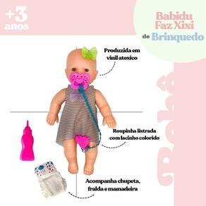 Esta boneca é a companheira perfeita para brincadeiras que ensinam cuidados e responsabilidades de uma forma divertida e envolvente.Com um design fofo, a boneca foi feita para que a criança tenha uma ótima imersão na hora da brincadeira, com um sistema em que quando ela bebe água, ela faz xixi na fraldinha. As crianças vão adorar alimentar a boneca e cuidar dela como se fosse um bebê de verdade, sendo uma maneira incrível de desenvolver habilidades de cuidado, empatia e imaginação enquanto se divertem. Além disso, conta com mamadeira, chupeta e fralda. Feita com materiais de alta qualidade, a boneca possui uma excelente durabilidade, perfeita para ser usada em muitas brincadeiras sem se preocupar com a integridade da boneca A boneca conta com:-01 Mamadeira-01 Fralda-01 Chupeta -Não recomendado para menos de 03 anos por conter partes pequenas que podem sem engolidas ou aspiradas.