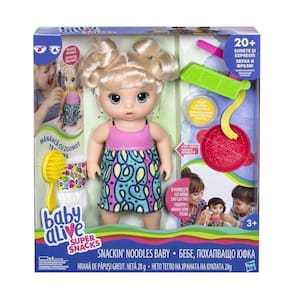 A Baby Alive Espaguete ama macarrão, ela não quer parar de comer! Com a Baby Alive Espaguete é possível fazer o seu próprio macarrão em uma mini-fabriquinha e ver a sua bebê se deliciar com a sua comida! Ela emite sons quando come, faz caquinha e possui cabelos sintéticos. Contêm 5 acessórios: 1 fabriquinha de massas, 1 refil de comida, tigela, fraldinha e escola de cabelo. Ela fala "PAPAI"!