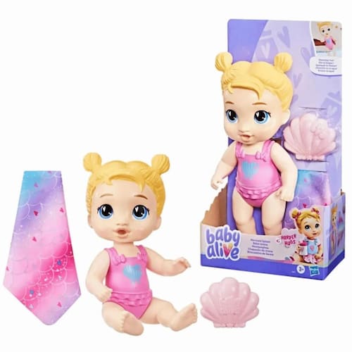 É hora de nadar com a boneca Baby Alive Mermaid Splash Haper Hugs Finja dar uma banho na bebê Harper e depois seque-a com a toalha de sereia incluída em brincadeiras fora d'água. Tem o corpo e o cabelo de plástico, além de uma roupa de banho feita usar na água. O corpo seguro para brincar na água permitirão que as crianças imaginem um dia na praia ou brinquem de tomar banho -- é só drenar a água da boneca e depois deitá-la para secar Vem com um borrifador de água em formato de concha para brincar. Imagine uma aventura de sereia com os brinquedos e as bonecas bebê da Baby Alive para meninas e meninos.