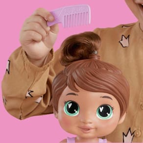 Dar banho na bebê: as crianças irão se divertir na hora do banho com sua nova amiga Frasco com bolhas mágicas: basta inclinar o frasco para ver as bolhas de mentirinha subirem e descerem as crianças podem brincar com o frasco com água ou shampoo infantil Boneca de 28 cm resistente à água: a boneca de 28 cm é ideal para abraçar e carregar por aí Enrolar na toalha: enrolar a boneca na toalha macia com fechos para encaixar Pentear cabelo: as crianças podem brincar de criar penteados com o pente e laço removível.