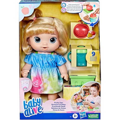 -É HORA DO SUQUINHO. A Baby Alive Hora do Suco é uma boneca de 30 cm que encanta as crianças com sua roupinha inspirada em frutas e acessórios cheios de detalhes. Um brinquedo lúdico e criativo para imaginar histórias divertidas.