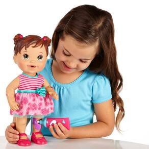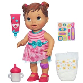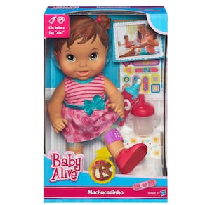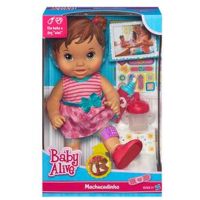 Ops, a Baby Alive se machucou! A sua filha vai adorar tratar a Baby Alive Machucadinho. Abra a curativo na perna da Baby Alive para começar a cuidar, passe a "pomadinha", feche e abra o curativo de novo e como mágica, o machucadinho melhorou! Você pode escolher qual curativo adesivo colocar na sua Baby Alive. Agora é hora de muito abraço e carinho! A boneca vem com pomadinha, adesivos curativos, mamadeira e fralda. Troque a fralda de sua Baby Alive depois de dar a mamadeira para ela!