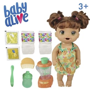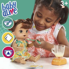Conteúdo da Embalagem: 1 boneca com roupa removível, 2 fraldas, 2 sachês de comida, liquidificador de brinquedo, colher, pente e instruções Código de barras: 5010993706419 Referência: E6944 Idade recomendada: A partir de 3 anos de idade.