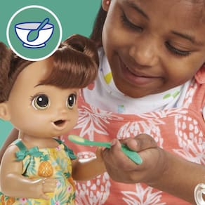 - Depois de fazer a papinha da bebê e alimentá-la, basta lhe dar água com a mamadeira. A boneca adora comer e beber