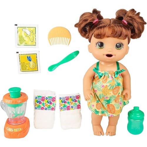 É muito divertido fazer papinhas para sua bebê com o liquidificador que funciona de verdade!! Basta abrir o sache, colocar no liquidificador com três colheres de sopa de água e apertar o botão para fazer a comidinha da sua bebê. A Baby Alive acompanha uma mamadeira, um liquidificador, dois saches, duas fraldas, uma colher e um pente lindo para poder pentear os cachinhos da sua bebê!! A bebê está pronta para a hora do lanchinho.