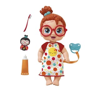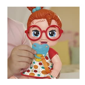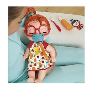 Boa noite, pequenina! As crianças podem brincar de preparar esta linda boneca de 28 cm para a hora de dormir. A boneca fecha os olhos quando recebe a chupeta. A chupeta fica presa ao pijama para não se perder. As crianças podem contar lindas histórias com a marionete de dedo em formato de joaninha e brincar de escovar os dentes com a escova de dente de brinquedo e a pasta de dente de mentirinha. Este kit de boneca bebê é um excelente presente para meninos e meninas.