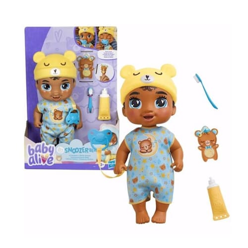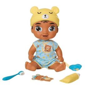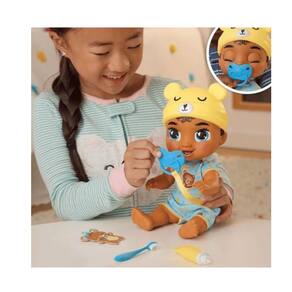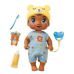 Boa noite, pequenino! As crianças podem brincar de preparar este lindo boneco de 28 cm para a hora de dormir. O boneco fecha os olhos quando recebe a chupeta. A chupeta fica presa ao pijama para não se perder. As crianças podem contar lindas histórias com a marionete de dedo em formato de urso e brincar de escovar os dentes com a escova de dente de brinquedo e a pasta de dente de mentirinha. Este kit de boneca bebê é um excelente presente para meninos e meninas.