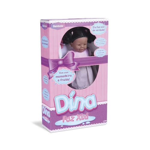 A Boneca Bambola Dina Negra Faz Xixi na Fralda vai encantar as meninas e deixar a brincadeira mais divertida. Tem 42cm, cabelos lindos que podem ser penteados, olhos fixos de polipropileno, um lindo vestido todo alegre e colorido, e membros e cabeça em vinil. Para completar, ela ainda faz xixi! Acompanha mamadeira e fralda.