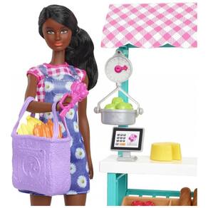 O que está na caixa Inclui boneca Barbie morena, banca de , caixa registradora, frutas, legumes, queijo, pão, flores e sacola de compras Marca: Não Informado