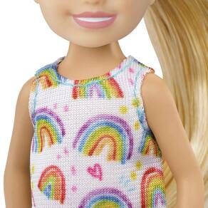Barbie Boneca Chelsea (loira) usando vestido com estampa de arco-íris e sapatos amarelos, brinquedo para crianças a partir de 3 anos de idade