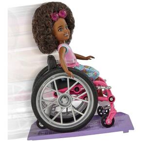 O que está na caixa Inclui boneca Chelsea com saia, sapatos e óculos de sol, 1 cadeira de rodas, 1 folha de adesivos e 1 rampa Marca: Não Informado