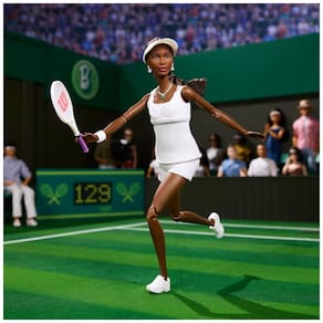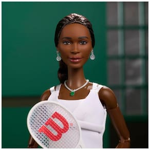 A boneca Barbie Inspiring Women Venus Williams homenageia a tenista campeã mundial e sua atuação em defesa da igualdade de premiação entre mulheres e homens no tênis. A boneca veste uniforme de tênis inspirado em seu visual de quadra, composto por top, shorts, viseira e tênis esportivos. Como referência ao torneio de 2007, ela usa um colar com pedra verde, reproduzindo o acessório real da atleta. ?O conjunto inclui uma raquete de tênis para compor poses de jogo e exibição. A embalagem é desenhada para exposição, permitindo que a boneca seja exibida em caixa, voltada tanto para colecionadores quanto para crianças a partir de 6 anos. ? Ficha Técnica