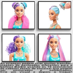 Mas as surpresas não param por aí. Abra a parte superior do tubo e retire uma boneca coberta da cabeça aos pés com glitter roxo Color Reveal. Continue desempacotando para encontrar um amigo de estimação e 10 mechas de cabelo coloridas que podem ser misturadas e combinadas entre a boneca e o animal de estimação, perfeito para criar diversos visuais e mudá-los sempre que quiser.