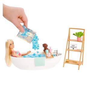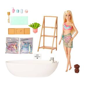 A boneca Barbie sabe que o autocuidado faz com que ela se sinta feliz e saudável! Este conjunto da Barbie com banheira de Confete é o jeito favorito da Barbie recarregar as energias.