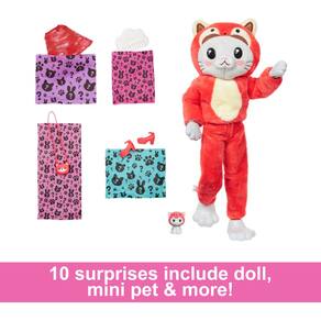 Boneca Barbie Cutie Reveal e acessórios com fantasia de animal e 10 surpresas, incluindo mudança de cor, Kitten as Red Panda em uma série temática de fantasias — Com 10 surpresas em 1, as bonecas da série Barbie Cutie Reveal oferecem a experiência de unboxing mais fofa com amigos de pelúcia, moda e diversão transformadora! - Qual boneca você vai revelar? Abra a caixa e encontre uma gatinha adorável vestindo uma fantasia de panda vermelha de pelúcia -- tão fofa! - Levante a cabeça do traje e revele uma boneca Barbie estilosa com longos cabelos pretos com mechas vermelhas, juntas posíveis e detalhes faciais brilhantes! - Abra as 4 sacolas surpresa para encontrar roupas e acessórios como uma saia, um par de sapatos, uma bolsa de panda vermelha, um pente e um adorável minianimal de estimação combinando! - As crianças podem vestir e estilizar a boneca Barbie invertendo a parte superior do traje para encontrar uma jaqueta de lã supermacia com uma estampa moderna. A cabeça do traje também se transforma em uma cama para o mini amigo de estimação! - Use água gelada e morna para transformar o rosto da boneca Barbie com detalhes de forma cintilante e para “abrir” e “fechar” os olhos do minianimal de estimação - repita várias vezes!