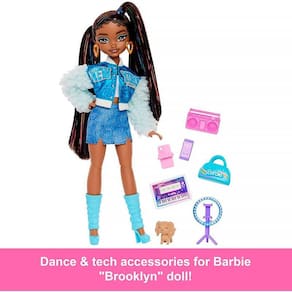 As bonecas Barbie Dream Besties encorajam as crianças a compartilhar seus talentos únicos com o mundo, assim como a Barbie Brooklyn. A Barbie Brooklyn sonha em se tornar uma coreógrafa mundialmente famosa e pode criar suas rotinas com acessórios como um tablet, um celular e uma boombox. A boneca Fashion inclui longos cabelos pretos, penteados em vários rabos-de-cavalo com detalhes brilhantes para um estilo divertido. As bonecas Barbie Dream Besties inspiram crianças a partir dos 4 anos de idade a viverem seus sonhos. A boneca não pode ficar em pé sozinha. As cores e as decorações podem variar.