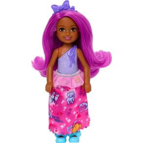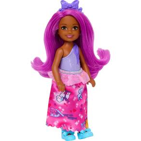 Barbie Boneca Dreamtopia Chelsea Royal com cabelo rosa, faixa de cabeça roxa e saia colorida, pequena boneca dobra na cintura