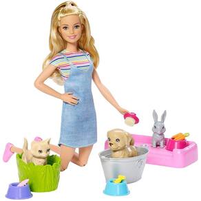 PRODUTO INTERNACIONAL. A boneca Barbie adora todos os animais - especialmente filhotes, gatinhos e coelhos. O playset Barbie Play 'n' Wash Pets tem um de cada para a boneca Barbie alimentar, brincar, lavar e aconchegar - além disso, cada um também tem um recurso legal de mudança de cor que incentiva a nutrição do jogo. Jovens amantes de animais se divertirão tanto explorando cuidados com animais de estimação com a boneca Barbie e seus três animais adoráveis, que adoram brincar lá fora nas poças e se sujar. Encha o balde decorado com água fria e coloque qualquer um dos animais dentro para brincar - oh não, que bagunça! Manchas lamacentas aparecem! Para "lavá-los", encha o balde prateado com água morna, mergulhe o animal de estimação e "limpe" com o pincel - as manchas desaparecem! Repita repetidamente para aproveitar o momento de mudança de cor e a diversão carinhosa. Três tigelas de comida e lanches únicos adicionam ingredientes para o tempo de alimentação, e uma cama para animais de estimação serve todas as três para um cochilo aconchegante. As crianças podem brincar o dia todo com a boneca Barbie e seus três amigos adoráveis. Ela usa uma camiseta listrada colorida sob um vestido jeans com sapatos rosa e tem joelhos que dobram para que ela possa cuidar do cachorrinho, gatinho e coelhinho! Colete outras bonecas Barbie e brinquedos para incentivar ainda mais a imaginação, pois quando uma garota brinca com a Barbie, ela imagina tudo o que pode se tornar! Inclui boneca Barbie usando modas e sapatos, três animais de estimação com característica de mudança de cor - um filhote, gatinho e coelhinho - um balde de grama, um balde de lavagem, um pincel, três tigelas de comida, um monte de cenouras, um peixe, um osso e uma cama de estimação. A boneca não pode ficar sozinha. Cores e decorações podem variar.