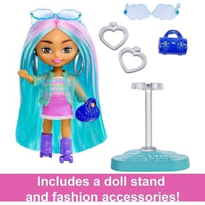 Barbie Extra Mini Minis são pequenas bonecas de 3,25 polegadas que agitam modas fabulosas e penteados enraizados.Esta boneca Barbie Extra Mini Minis dá vibrações esportivas Ela tem longos cabelos azuis com mechas rosa e usa um top arco-íris e uma saia rosa com uma jaqueta transparente.Quatro acessórios elevam seu conjunto: óculos de sol coloridos, brincos em forma de coração, uma bolsa e patins roxos - porque o que é mais extra do que deslizar sobre rodasCom uma roupa tão atraente, esta boneca é para exibição Ela vem com um carrinho de boneca com o logotipo da Barbie Extra Mini Minis.As bonecas Barbie Extra Mini Minis incentivam a exploração criativa do estilo e o jogo da moda, sendo ótimos presentes para os amantes da moda - especialmente aqueles que adoram ser extras005012/2021