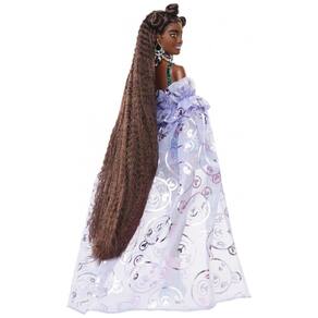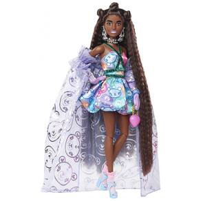 As bonecas Barbie Extra Fancy levam sua aparência para o próximo nível em vestidos glamorosos prontos para tapete vermelho com detalhes e acessórios luxuosos, bem como um animal de estimação para combinar com sua aparência única. O visual da boneca Barbie fica grande com cabelos crespos extralongos e penteados em nós bantu. Ela mostra seu estilo confiante em um vestido divertido e glam com estampa de urso de pelúcia arco íris e detalhes de alça verde brilhante, em camadas com um vestido de capa de ursinho de pelúcia combinando com estampa de alumínio. Saltos azuis, meias rosa, micro óculos de sol metálicos, luvas roxas, uma bolsa em forma de coração e muitas joias luxuosas em camadas inspiram a auto expressão e a diversão de contar histórias. Seu ursinho de estimação também é muito especial, com bochechas estampadas de coração e uma expressão adorável