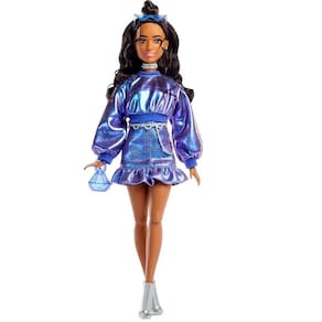 -Esta boneca Barbie é a definição de metálico com um outfit brilhante! Seu suéter azul gelo e cropped combina perfeitamente com uma saia de babados