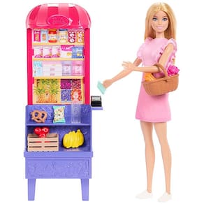 A imaginação pode criar todo tipo de história com o conjunto Barbie Malibu no Mercado. Inspirado no filme Barbie e Teresa Recipe for Friendship, o conjunto de jogos com tema de comida permite que as crianças decidam o que está no menu. O estande de mercado tem um design colorido, fofo e prateleiras para exibir alimentos e bebidas. Onze acessórios temáticos incluem uma cesta de compras, caixa de produtos e scanner de cartão para uma brincadeira realista. A boneca Barbie 'Malibu' usa uma roupa rosa fofa e tênis para sua ida à loja. Crianças e fãs vão adorar recriar cenas do filme e inventar novas receitas para a aventura!