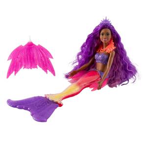?A Barbie® tem um visual mágico de sereia, com cabelos longos roxos e uma bela cauda ombré com toques de alta qualidade e escamas esculpidas.