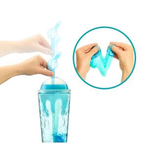 As crianças Retiram a Camada Externa da Embalagem, Abrem o Copo e Retiram Os Sacos Surpresa, Depois Rosqueiam a Tampa Novamente e Abrem a Parte Superior com o Pedaço em Forma de Canudo Para Liberar a Gosma Rosa e Fofa Nos Cubos de Gelo.