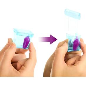 As crianças Retiram a Camada Externa da Embalagem, Abrem o Copo e Retiram Os Sacos Surpresa, Depois Rosqueiam a Tampa Novamente e Abrem a Parte Superior com o Pedaço em Forma de Canudo Para Liberar a Gosma Rosa e Fofa Nos Cubos de Gelo.