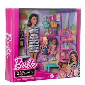 O Conjunto Barbie Primeiro dia de aulas está repleto de possibilidades e maneiras de brincar! Com mais de 20 peças, incluindo uma boneca Barbie professora, duas bonecas bebês, um quadro-negro, prateleira, mesa e cadeiras, as crianças podem criar a sala de aula perfeita. A imaginação é abastecida com todo o material escolar necessário para a brincadeira com acessórios como lápis, tesoura, cola, livros, brinquedos e muito mais! As bonecas não podem ficar em pé sozinhas.