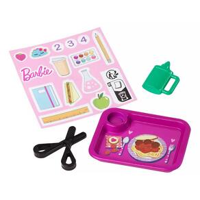 Outros acessórios da sala de aula incluem uma cadeira, tesoura, cola, caderno e um almoço.