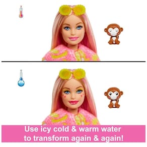 Com 10 surpresas em 1 pacote, as bonecas Barbie Cutie Reveal Jungle Series oferecem a mais fofa experiência de unboxing com amigos animais de pelúcia, moda e diversão transformadora Abra a caixa para encontrar um macaco de pelúcia atrevido com uma boneca Barbie dentro. Qual boneca você vai revelar Levante a cabeça da fantasia e revele uma boneca Barbie articulada com longos cabelos com mechas rosa e detalhes brilhantes nos olhos e no rosto. Abra as 4 sacolas surpresa para encontrar modas e acessórios como shorts fofos, um par de sapatos, pente de esponja, óculos de sol e um adorável mini macaco combinando. As crianças podem vestir e estilizar a boneca Barbie invertendo a parte de cima da fantasia para encontrar uma jaqueta de lã supermacia com estampa de banana. A cabeça da fantasia também se transforma em uma cama para o mini amigo de estimação Use água gelada para transformar o rosto da boneca Barbie com pintura facial divertida da selva e para abrir e fechar os olhos do mini animal de estimação. Mude de volta com água morna. Repita de e de As bonecas Barbie Cutie Reveal Jungle Series são um ótimo presente para crianças de 3 a 7 anos, especialmente aquelas que adoram descobrir surpresas fofas