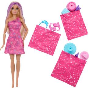 Boneca Barbie Rise & Surprise com acessórios da série Festa de Aniversário de Pets, com 12 surpresas incluindo escorregador e atividade de mudança de cor (modelos podem variar).
