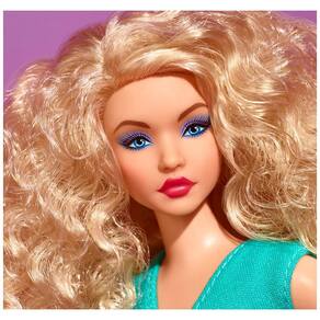 O corpo curvy utiliza o sistema Made to Move, com articulações em pescoço, ombros, cotovelos, punhos, torso, quadris, joelhos e tornozelos para maior precisão de posicionamento. O calçado consiste em sandálias plataforma altas em tom berry, dimensionadas para garantir estabilidade em superfícies planas durante a exposição em prateleiras ou vitrines. A embalagem inclui suporte para boneca e Certificado de Autenticidade, atendendo a colecionadores que buscam identificação oficial de linha e modelo.