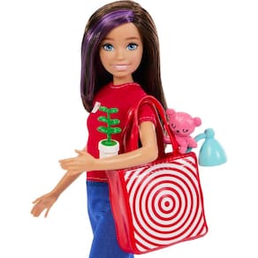 - A boneca Skipper veste uma camiseta vermelha com crachá de nome Target, calça jeans e tênis brancos.