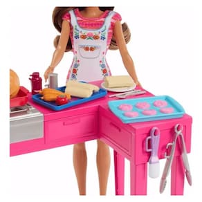 -Inspirado no filme Barbie e Teresa: Receita de Amizade, o conjunto apresenta uma peça de mobília de cozinha com recursos interativos, como um forno giratório, tamales que se encaixam em uma panela e biscoitos que mudam de cor.