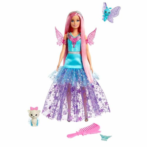 Boneca - Barbie Um Toque de Mágica - Malibu Roberts - Mattel: Esta Barbie só pode ser descrita como mágica com um longo cabelo colorido e vestido brilhante! A Barbie "Malibu" Roberts tem um visual brilhante inspirado em Barbie A Touch of Magic. Dois bichinhos de estimação e acessórios para o cabelo complementam a diversão fantástica! Detalhes: • Inspirada no visual brilhante de Barbie A Touch of Magic, a Barbie "Malibu" Roberts vem com vestido, bichinhos de estimação e acessórios inspirados nos contos de fadas. • Esta Barbie dá um toque mágico à brincadeira de pentear o cabelo! Ela tem cabelo rosa pastel de 18 centímetros e inclui acessórios, como pente, tiara brilhante e grampo decorativo. • A Barbie "Malibu" usa um vestido em camadas com toques de asas na gola. A longa saia de tule brilha com as estrelas, já os braceletes brilhantes dão asas e aprimoram o visual mágico! • Os bichinhos de estimação também são fantásticos! Ela vem com um adorável amigo borboleta, além de cachorrinho vestindo um belo tutu Informações: • Produto: Boneca Barbie Malibu Roberts • Marca: Mattel • Coleção: Barbie • Serie: Barbie Um toque de Mágica (a Touch of Magic) • Tipo: Boneca com Acessórios • Categoria: Bonecas e Cia • Tamanho (Altura): Boneca 30 cm • Conteúdo: - 01 Barbie com vestido e braceletes - 02 bichinhos de estimação - 01 pente - 01 tiara - 01 enfeite de cabelo • Recomendação: para crianças a partir de 03 anos de idade Especificações: • Referência: HLC32 / HLC31 • Código de Barras: 194735112197 • Embalagem (C x A x L): 19.5 x 32.7 x 6.5 cm • Embalagem (Peso): 0.330 kg • Material / Composição: Plástico • Registro: 005 388/2021 • Certificado: Órgãos Autorizados - OCP´S (Organismos de Certificação de Produtos) Aviso: • As imagens são meramente ilustrativas • Os pesos, tamanhos e medidas são aproximados • As cores e estampas dos produtos podem ter variações • As informações são de responsabilidade do fabricante ou fornecedor