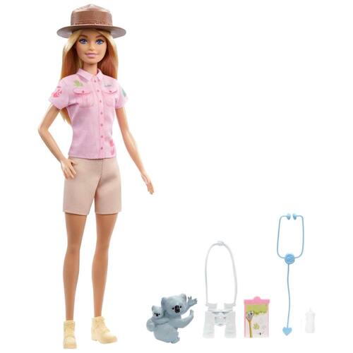 Boneca Barbie Zoologist com mamadeira, figura de coala e bebê, estetoscópio, prancheta e binóculos.