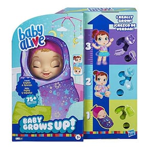 PRODUTO INTERNACIONAL. PRODUTO INTERNACIONAL.Ela realmente cresce! Baby Alive Baby Cresce Boneca interativa transforma de recém-nascido para bebê para menina grande. Ela muda de tamanho 10 cm com cuidados infantis! As crianças também vão adorar seus 8 acessórios de boneca com tema sonhador. Será que ela será Shining Skylar ou Star Dreamer? Revele 1 de 2 bonecas surpresa enquanto você a tira do pacote e ela começa a mexer! Com a primeira garrafa, ela abre os olhos para revelar a cor. Remova o chapéu para ver a cor do cabelo. Depois de balançar e fingir a alimentação de mamadeira, ela chuta para fora de seu cobertor de swaddle! Quando bebê, Baby Alive Baby Cresce Boneca Falante senta-se e diz sua primeira palavra. As crianças podem ajudá-la a crescer com a falsa alimentação de bolsas e movimentos saltitantes. Segure as mãos dela para ajudá-la a ficar de pé. Agora ela é uma garota grande que adora se vestir! Uau, o cabelo dela fica comprido quando você usa o pincel dela e puxa para estendê-lo! Instruções e guia de início rápido ajudam as crianças a cuidar de sua boneca em crescimento em cada estágio e redefini-la para jogar novamente! Baby Alive e todas as propriedades relacionadas são marcas comerciais da Hasbro.