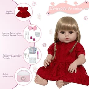 O enxoval da Boneca Bebê Reborn Realista Menina Loira é completo e acompanha diversos itens para tornar a brincadeira ainda mais divertida. Além da boneca, o kit inclui: 1 vestido, 1 par de cílios, 1 par de brinco, 1 chupeta, 1 mamadeira simples, 5 certificados, 3 fraldas, 1 laço de cetim, 2 presilhas, 1 par de luvas, 1 bolsa maternidade e 1 kit de pente e escova simples.