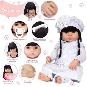 A Boneca Bebê Reborn Realista Morena Enxoval Com Bolsa Vários Itens possui altura de 46cm e peso aproximado de 0,745 Kg. Ela é certificada pelo INMETRO e recomendada para crianças maiores de 03 anos.