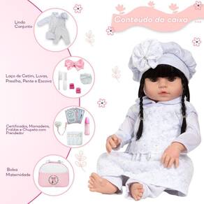 Acompanhando a boneca, você receberá um completo enxoval com diversos itens, como roupa luxo, cílios, brinco, chupeta, mamadeira, certificados, fraldas, laço de cetim, presilhinha, luvas, bolsa maternidade e kit pente e escova. Tudo isso para garantir a melhor experiência de brincadeira.