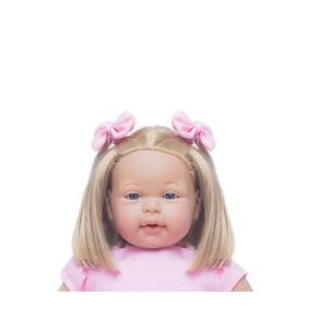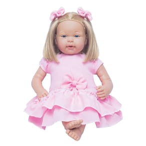 Com aproximadamente 45cm de altura, a boneca tem o corpo em pano macio e a cabeça, braços e pernas em vinil suave, com detalhes que imitam um bebê de verdade. Seu rostinho expressivo, cabelos loiros e vestidinho rosa tornam a brincadeira ainda mais especial. A grande novidade é que ela fala frases ao apertar a barriguinha e emite sons ao ser deitada ou balançada, deixando a interação ainda mais envolvente